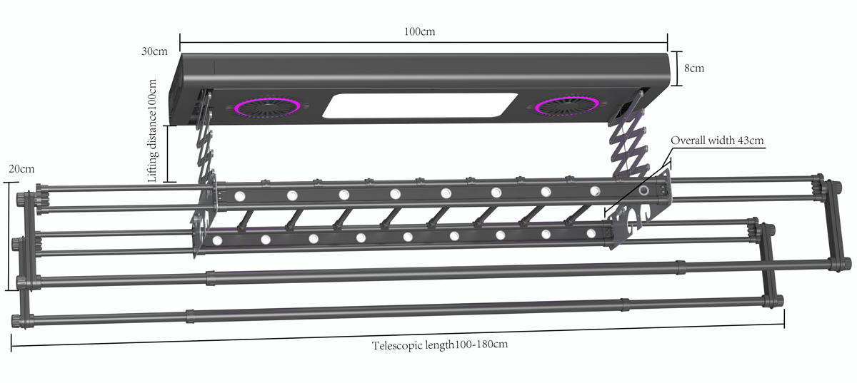 型号:LY1051B产品名称:玄铁灰色主机所属类别:智能升降晾衣机控制方式:声控+遥控控制配置:照明+风干+烘干+4主杆+8横杆